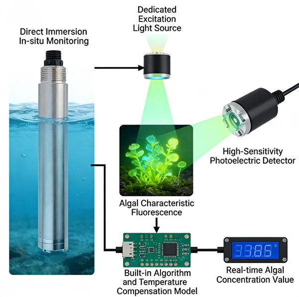 O equipamento não requer reagentes químicos nem pré-tratamento da amostra de água durante todo o processo e permite o monitoramento direto in situ por imersão na água. Baseando-se nas características únicas de fluorescência da ficocianina e da clorofila das algas verde-azuladas, o equipamento possui uma fonte de luz de excitação dedicada e um fotodetector de alta sensibilidade. Após excitar as células das algas para gerar fluorescência característica, o equipamento converte rapidamente o sinal de fluorescência em valores de concentração de algas por meio de um algoritmo integrado e um modelo de compensação de temperatura. Com resposta rápida e alta precisão de detecção, o equipamento reflete com precisão a situação das algas em corpos d'água em tempo real, resolvendo completamente o problema de atraso dos métodos de detecção tradicionais.