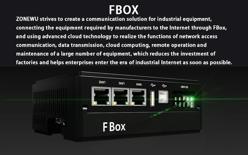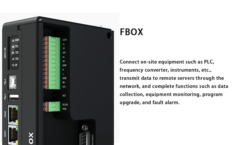 O FBOX é um terminal inteligente de aquisição de dados para uso em campo, integrado à plataforma Industrial IoT, que permite a coleta, o download e a manutenção remotos e convenientes de dados de equipamentos em campo. Com suporte para mais de 350 protocolos de drivers de dispositivos industriais e múltiplas interfaces de comunicação, ele atende aos requisitos de rede da maioria dos controladores industriais. O sistema suporta diversos métodos de acesso à internet e servidores em nuvem. Funções de configuração, diagnóstico e gerenciamento remotos podem ser implementadas diretamente por meio da plataforma de gerenciamento remoto.
