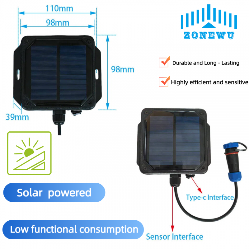 O sensor solar LoRa ZONEWU para EC/pH/temperatura e umidade do solo é um dispositivo de monitoramento ambiental que integra alimentação solar e tecnologia de comunicação remota. Sua principal função é coletar dados em tempo real de EC/pH/temperatura e umidade do solo.